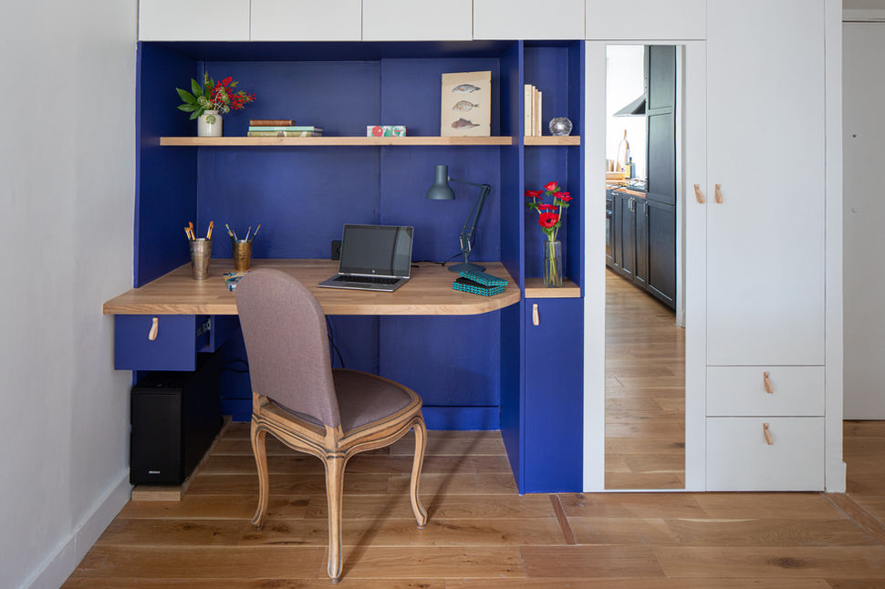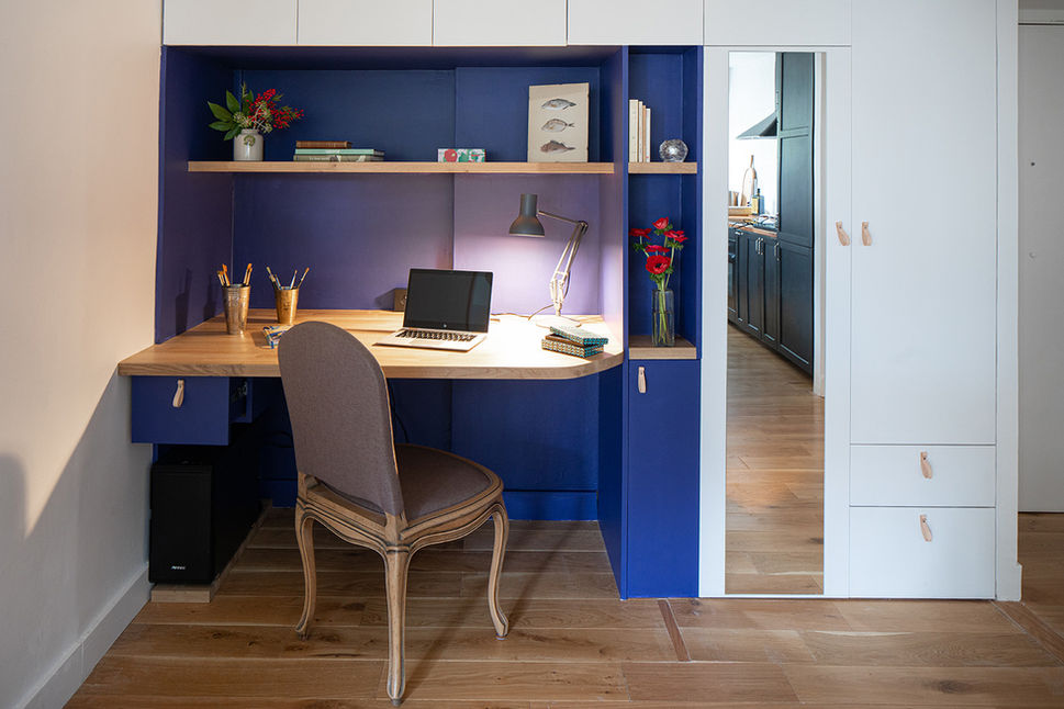 Bleu roi, télétravail, optimisation, multifonction, rythmes, rangement, sur-mesure, bois, plan, couleur, aplat, cadrage