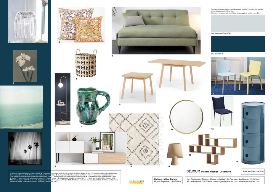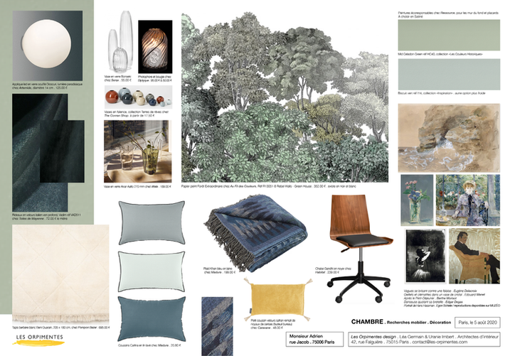 Moodboard, conseil, couleurs et  matériaux, planches tendances, esquisses, perspectives, projets, transitionnel, mix and match, vintage, authentique, intemporel, caractère, artisanat, naturel, sobre, touches de couleurs, élégance, chaleureux...