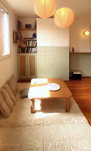 Chambres, séjour. Japandi, contemporain, graphique, touches rétro, bois, matières naturelles, rythmes, chaleur, vert et ocre, mix and match, caractère. Enfance, imagination, couleurs, ludique. Repos, bleu-vert, canard, sobriété.