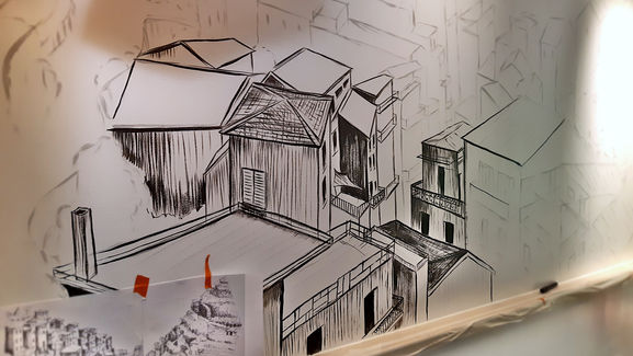Rue des Martyrs, Paris, restaurant italien, Cinque Terre, noir et blanc, peinture, décoration, art mural, conseil décoration, perspective, dessin original, Manarola, paysage